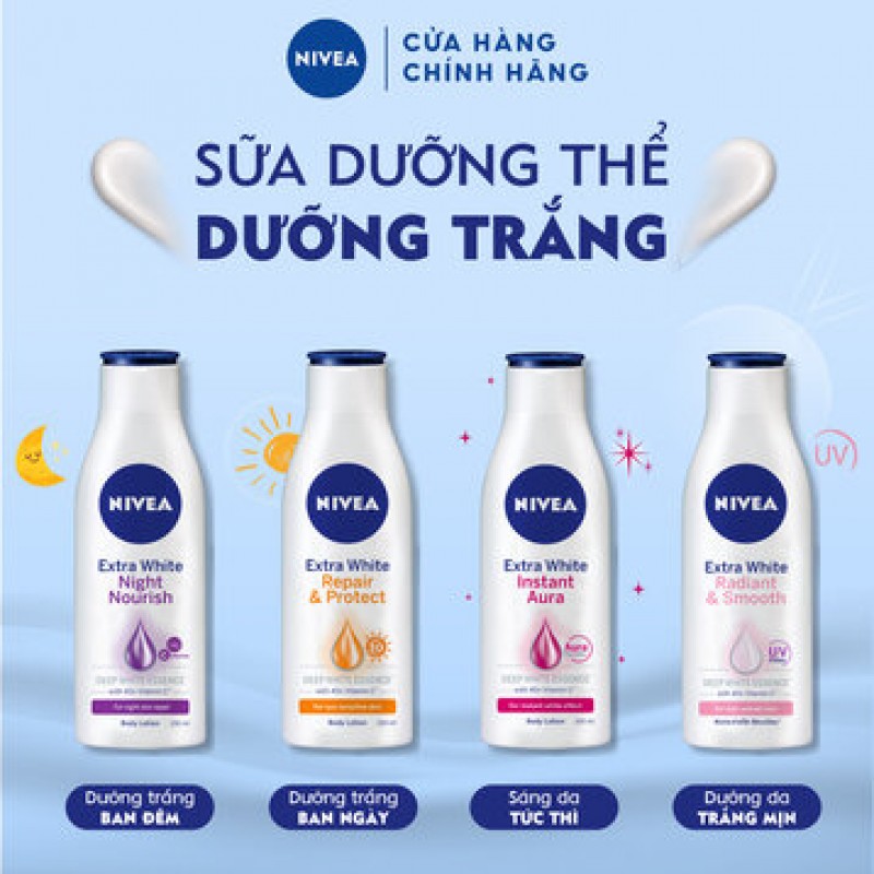 Sữa Dưỡng Thể Nivea Extra White Body Lotion là dòng sản phẩm dưỡng thể làm sáng da toàn thân nổi tiếng của thương hiệu NIVEA, với công nghệ Deep White Essence chứa các hạt phân tử dưỡng sáng siêu nhỏ cùng hàm lượng Vitamin C cô đặc gấp 40 lần, nuôi dưỡng sâu các tế bào da, mang lại cho bạn làn da sáng mịn rạng rỡ.