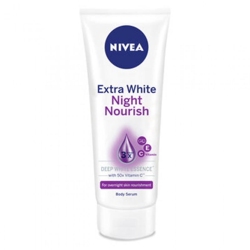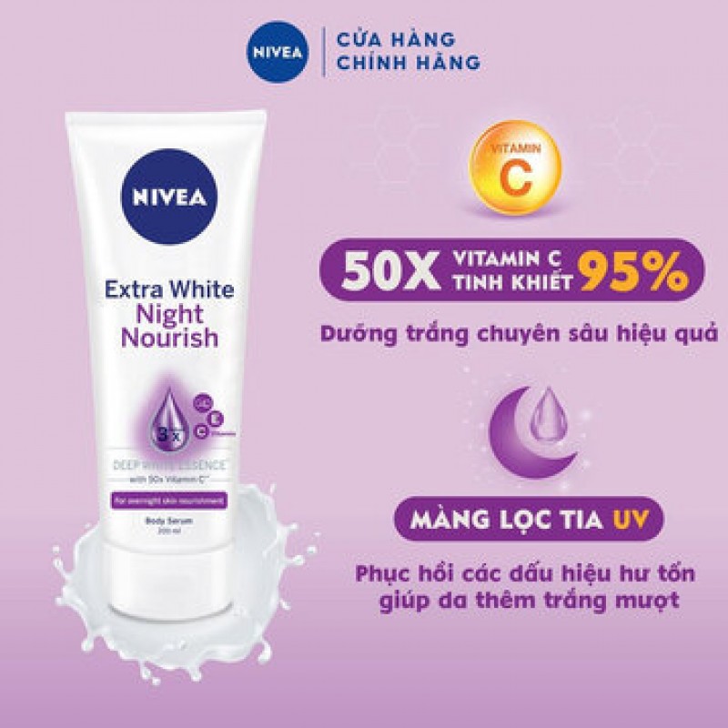 Tinh Chất Dưỡng Thể Dưỡng Sáng Ban Đêm Nivea Extra White Night Nourish Body Serum có công thức được tăng cường 10 dưỡng chất quý giá, trong đó chứa hàm lượng Vitamin C gấp 50 lần giúp dưỡng da sáng mịn đều màu. Đặc biệt, công thức Deep White Essence có cấu trúc phân tử siêu nhỏ thấm nhanh và sâu vào da, giúp phục hồi và dưỡng sáng da hư tổn và sạm đen lâu ngày do nắng gắt.